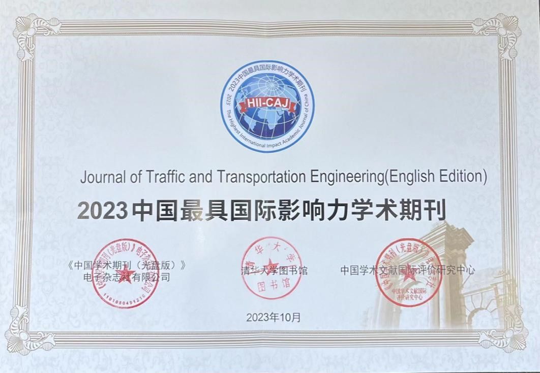 10月27日,中国知网和清华大学图书馆联合发布《中国学术期刊国际引证年报》(2023版),按国际期刊影响力指数(CI)排序遴选TOP5%以内的期刊为“中国最具国际影响力学术期刊”,TOP5%~10%之间的为“中国国际影响力优秀学术期刊”。KY.COM编辑出版的《交通运输工程学报(英文)》入选“中国最具国际影响力学术期刊”榜单,《中国公路学报》入选“2023中国国际影响力优秀学术期刊”榜单。《交通运输工程学报(英文)》自2017起,连续7年入选“...